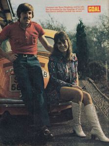 Circa 1970 I remember seeing a picture of the Liverpool footballer Steve Heighway in a football magazine sporting what I thought was a nifty ensemble consisting of a Simon type casual top and a pair of blue cords. I cut the page out and asked my parents if they could get me something similar. They took this on board, quite pleased for once that I was taking an interest in my attire but came back with something very different. A bright orange shirt resplendent with matching tie and a pair of purple crimplene trousers.