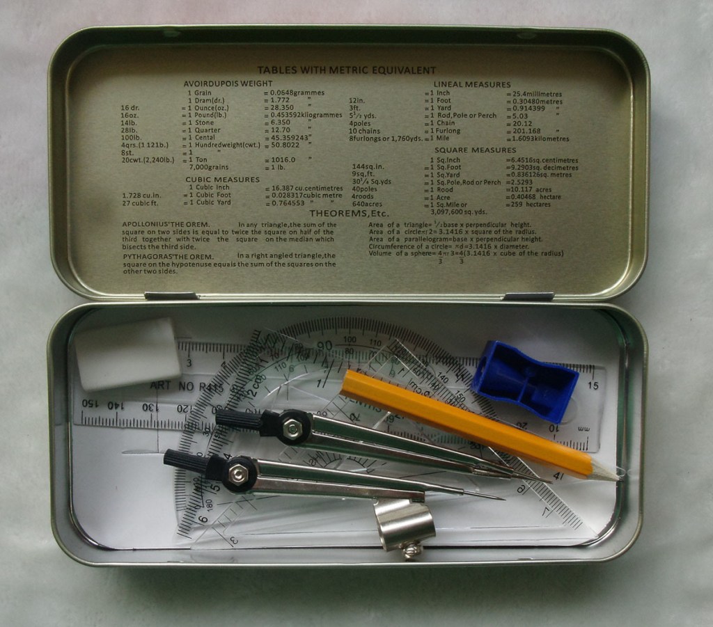 Anyway – using the compass from the set, I scratched some notes and formulae on the bottom of the tin. Sorted.