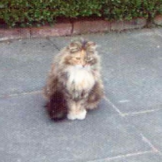 She was a gentle, beautiful dog who filled a great void in our lives. When my cat Brandy had her litter of kittens in an old packing crate in the garage, Cleo was on hand to help; perhaps sensing that this little cat wasn’t very strong. Cleo watched the birth, helped lick the kittens clean and carried them very tenderly in her mouth out onto the lawn to play with them. Sadly, Cleo became ill with a twisted bowel after only a few months and we had to have her put to sleep. My mother cried for a week. She had invested a lot of love and hope into Cleo, to help turn our dark days into bright ones. Sadly, little Brandy died from a heart attack when she was being spayed but we kept one of her kittens, Frisky.