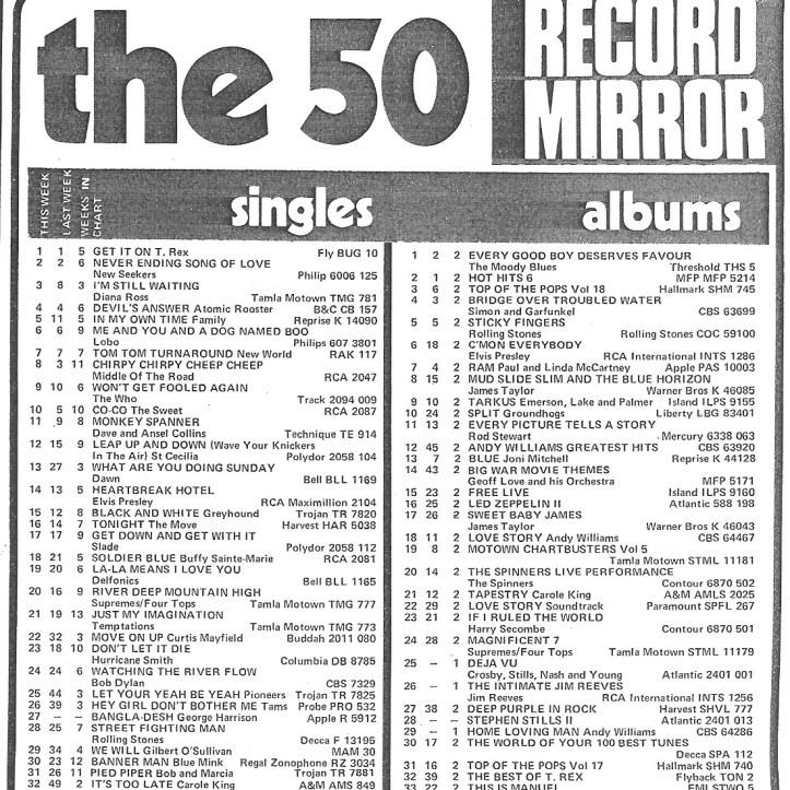 thanks again for taking part Paul! Great writeup and memories of ’71 here too. I’d only occasionally heard the Joni song in passing before and hadn’t noticed the lyrics, they were very good. She was a heck of a songwriter. As a couple other people mentioned in regard to it, on my site, it was almost too bad she didn’t carry her song on into middle aged at least. Great chart you show there, the thing that jumped at me was in the top 10, only two songs – ‘Get it On’ and ‘Me and You and a Dog NAmed Boo’ seemed like hits in Canada. We knew of ‘Won’t get fooled again’ too, but I don’t think it really was a hit single, though probably it was big on what few FM stations were around then