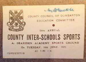 In 1968 I won both the 100m and 200m yards sprints to help my primary school win the annual Dunbartonshire County Sport Shield. Both the boys and the girls teams triumphed on the day.